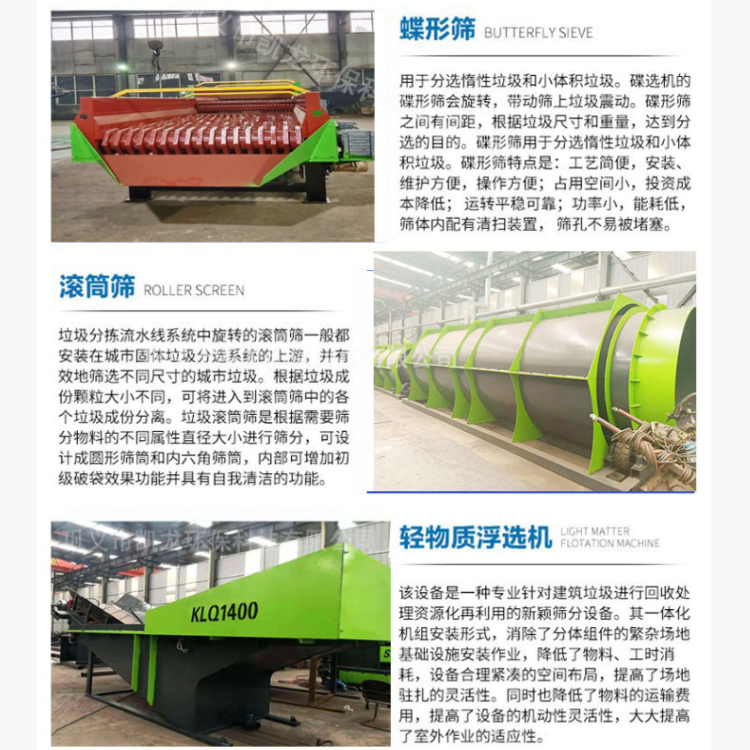 建筑垃圾分離機是后續(xù)處理,運用廢棄物中的有用成分,先將廢棄物中的有機化合物、易燃物、金屬、塑膠等歸類,依據(jù)各構件的特性和實際經驗,設計方案智能化垃圾分選生產流水線。